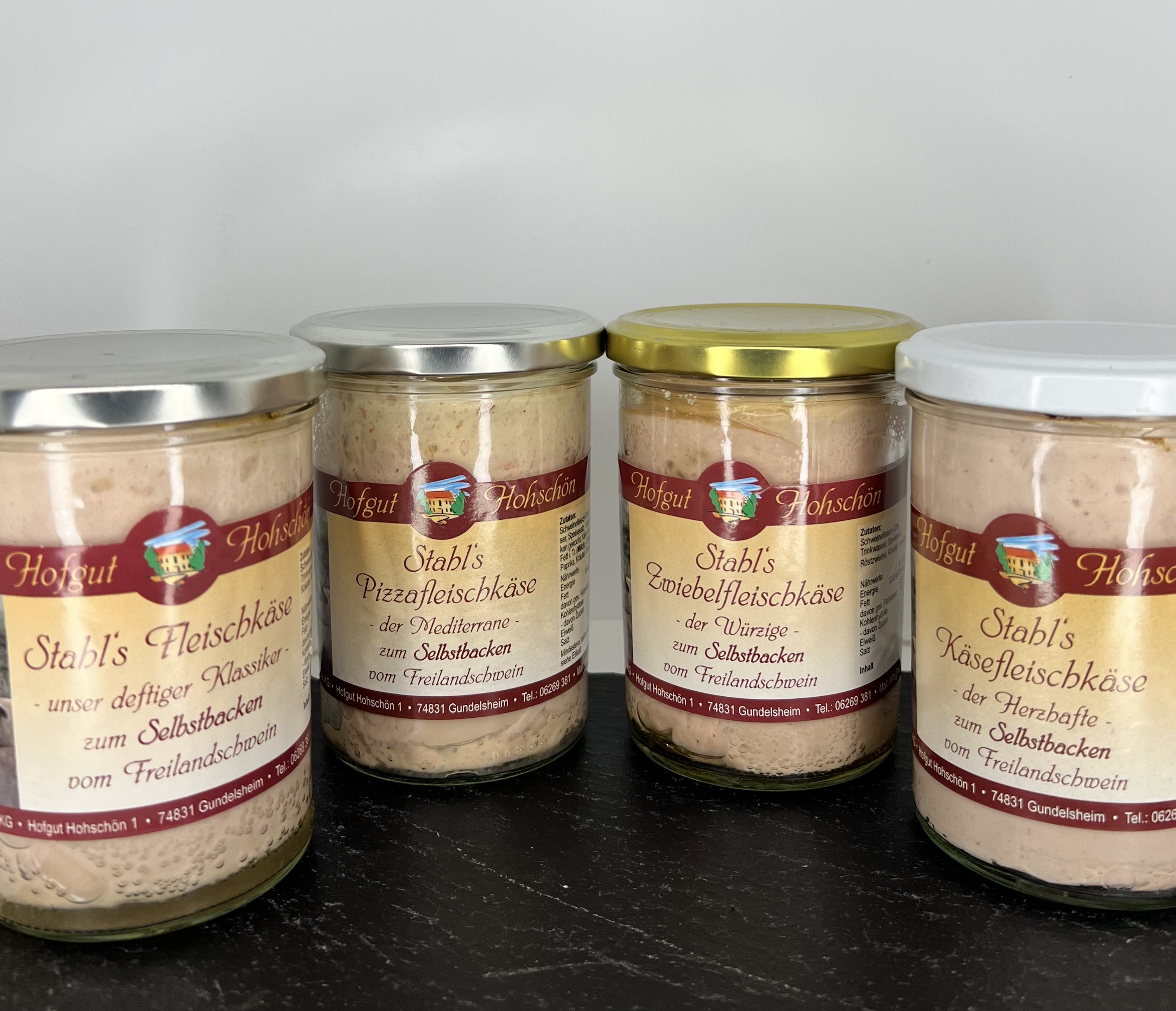 1 x Stahl's Fleischkäse "klassik" (360 g) 1 x Stahl's Käsefleischkäse (360 g) 1 x Stahl's Pizzafleischkäse (360 g) 1 x Stahl's Zwiebelfleischkäse (360 g)