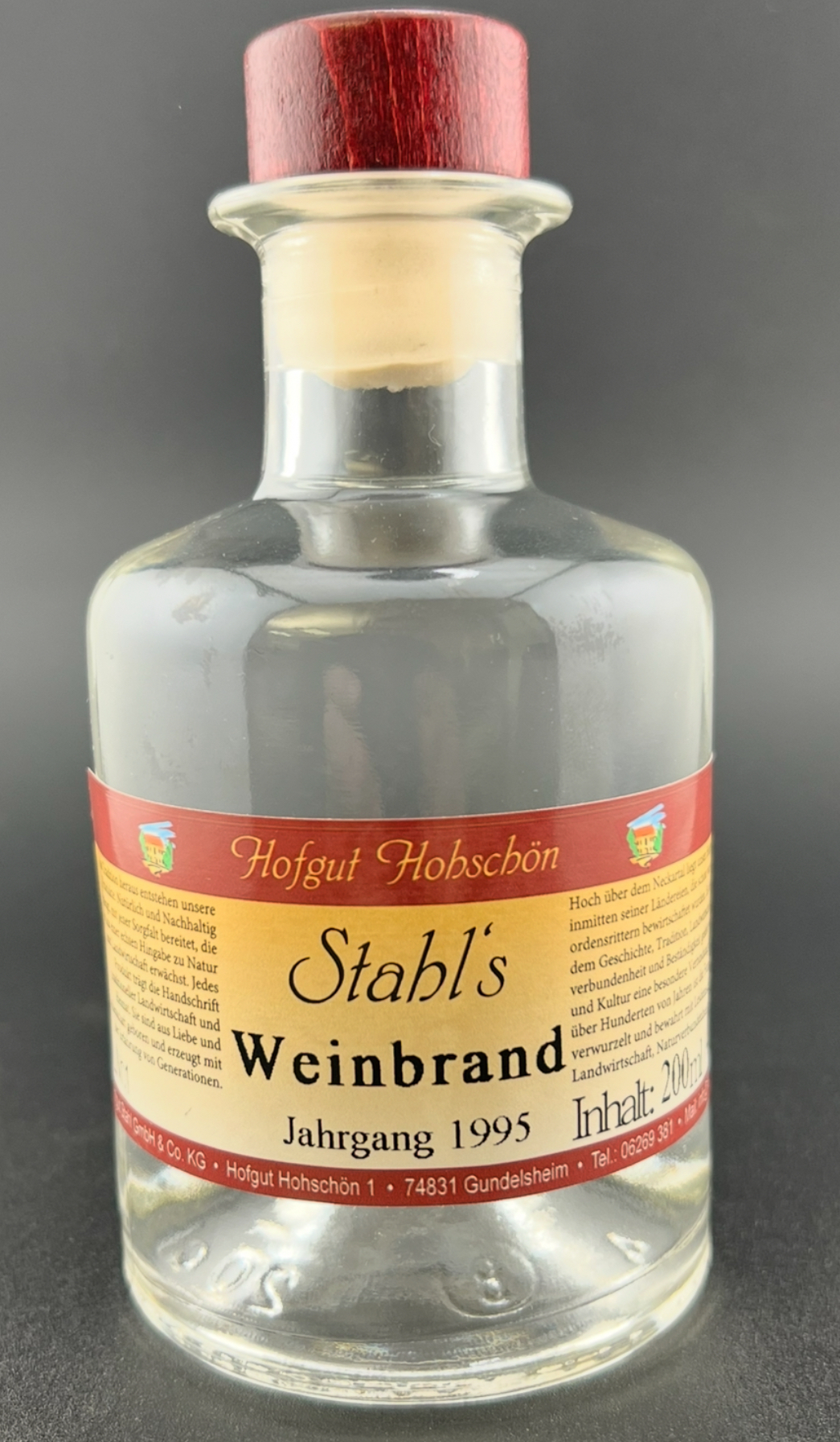 Im Jahre 1995 hat sich Herr Stahl entschlossen, aus einem Riesling einen Weinbrand zu machen. Das einmalige Aroma und die Spitzenqualität haben ihn veranlasst, eine kleine Menge in alte Glaskolben abzufüllen und in unseren Gewölbekellern für viele Jahrzehnte einzulagern um ihm Ruhe und Zeit zu geben, eine ganz besondere Reife zu entwickeln.