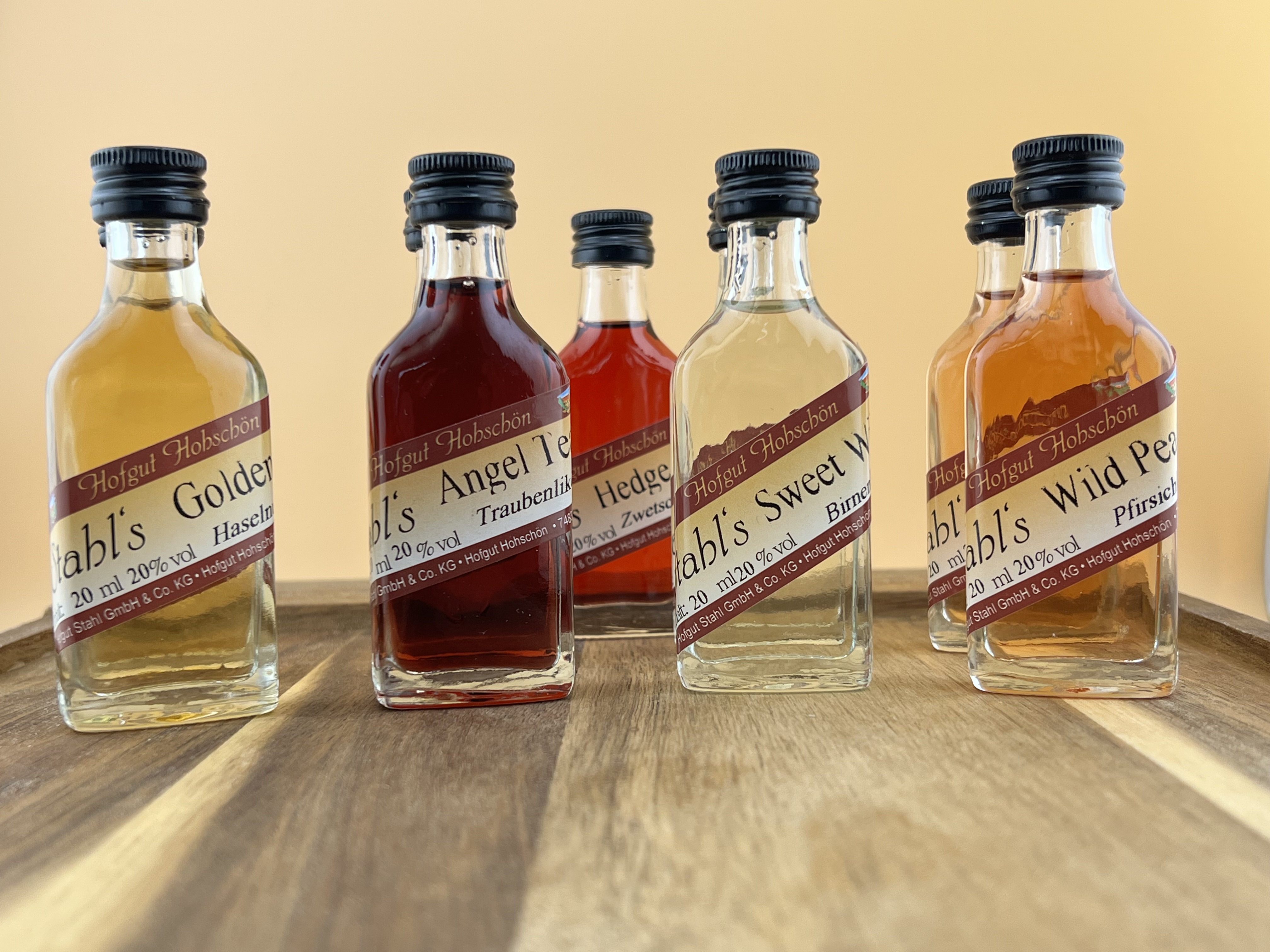 2 Golden Nut Haselnusslikör, 2 Wild Peach Weinbergpfirsichlikör, 2 Sweet Willi Williams Christ Likör und 2 Sun Cherry Kirschlikör und 2 Hedge Plum Heckenzwetschgenlikör